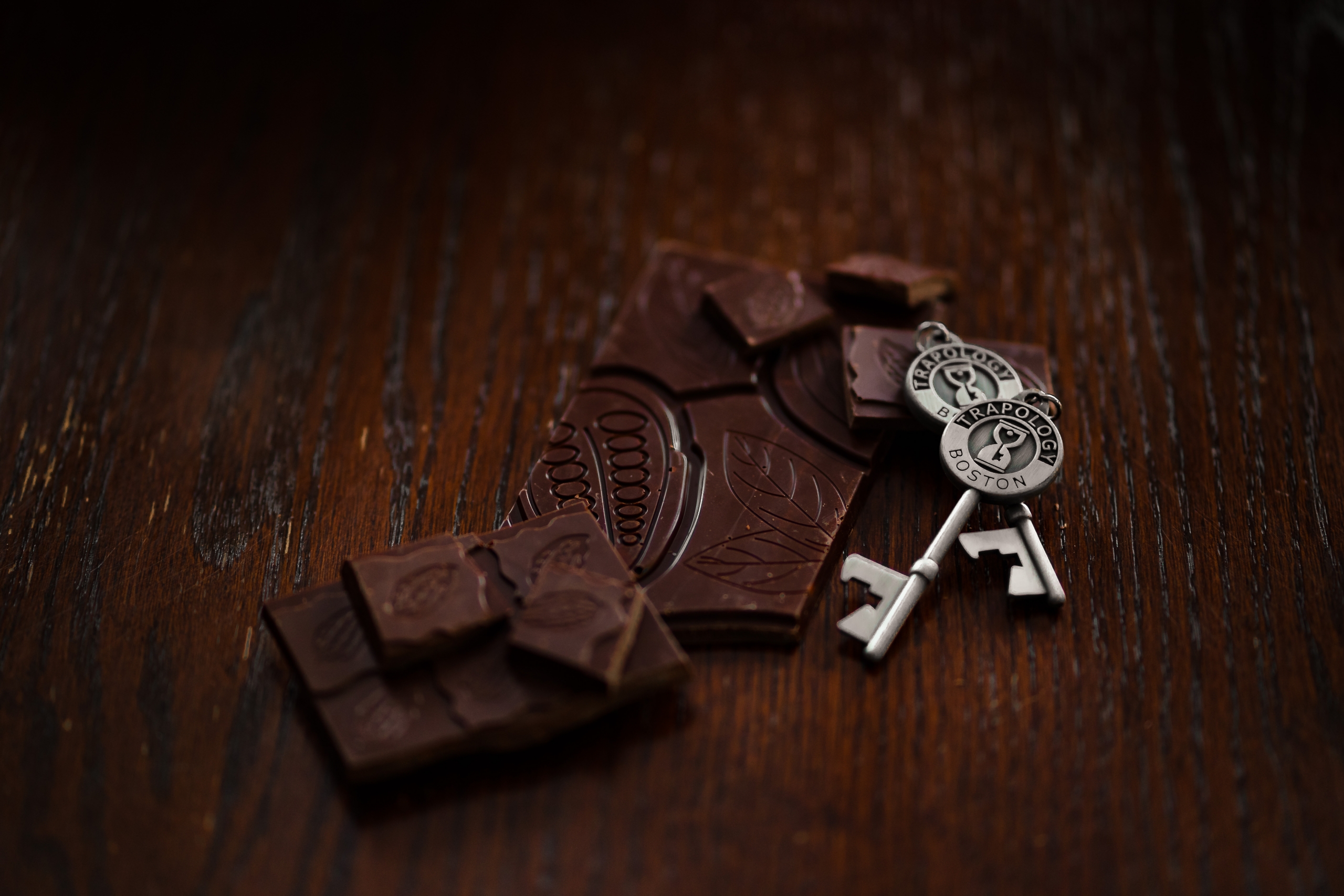 Two chocolate bars from New England Chocolatiers carefully cultivated by Cocoa Beantown Boston and a mini Valentines Day themed puzzle adventure handcrafted by Trapology Boston
